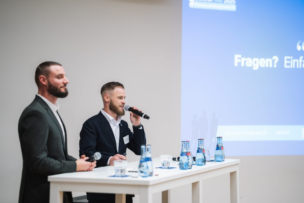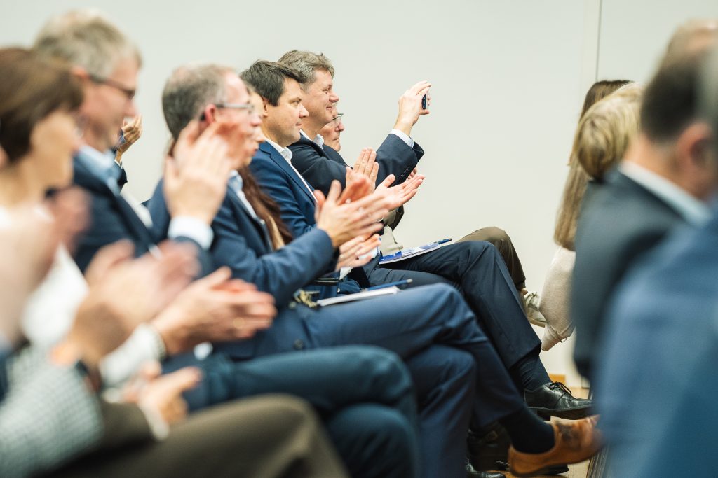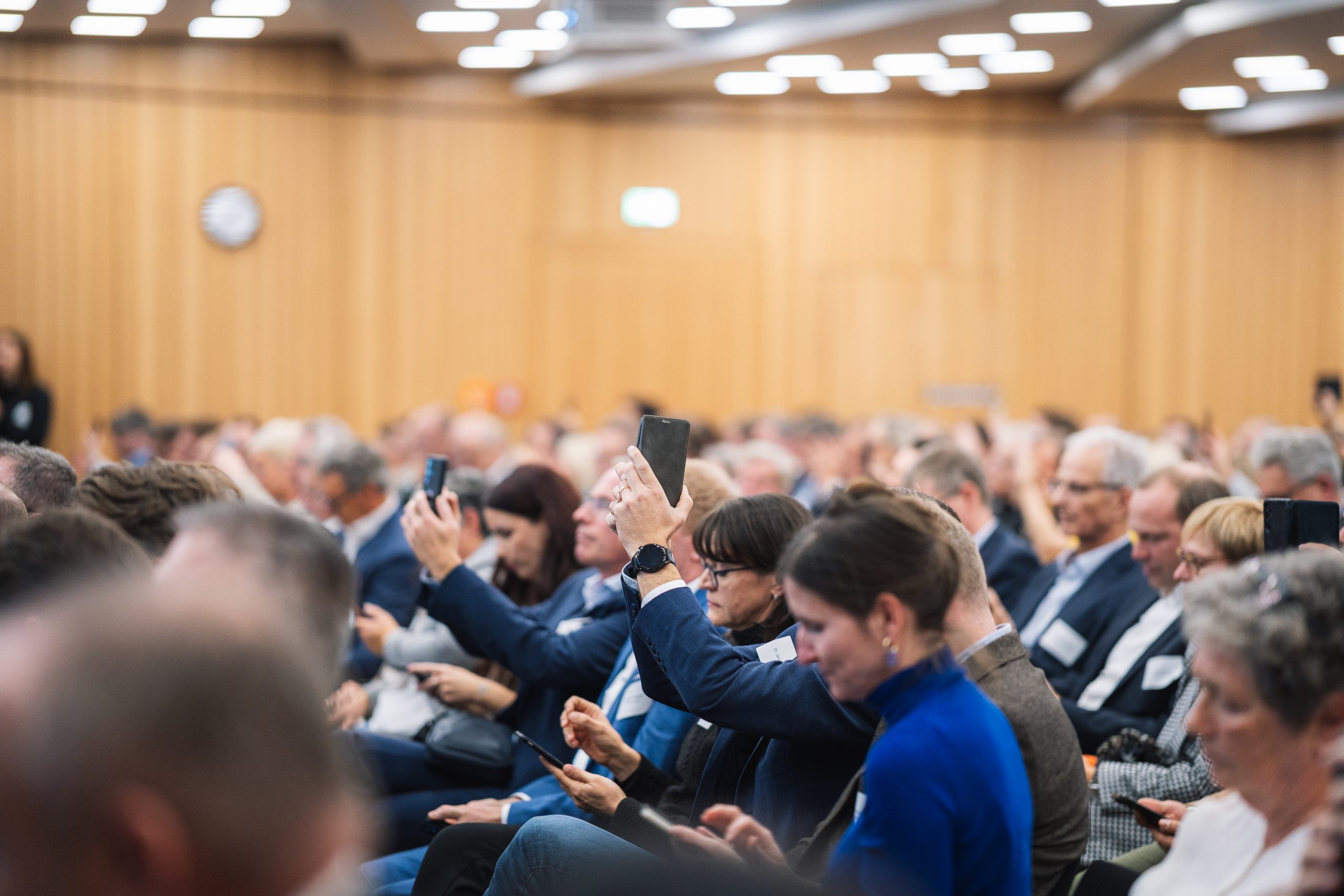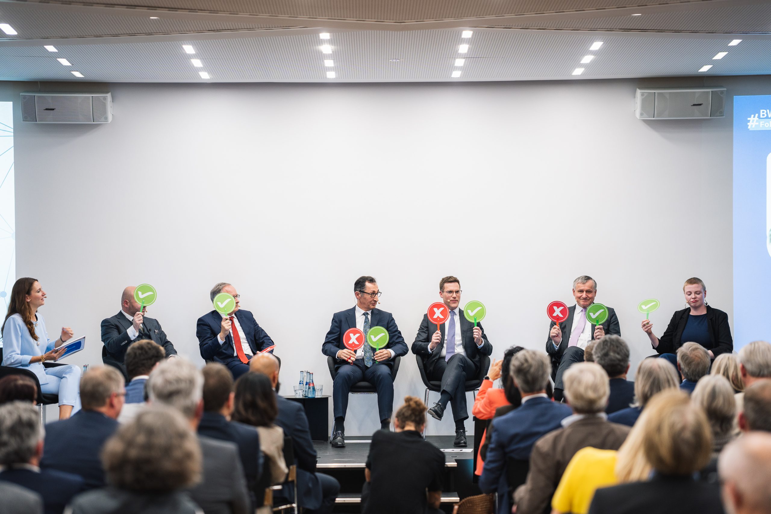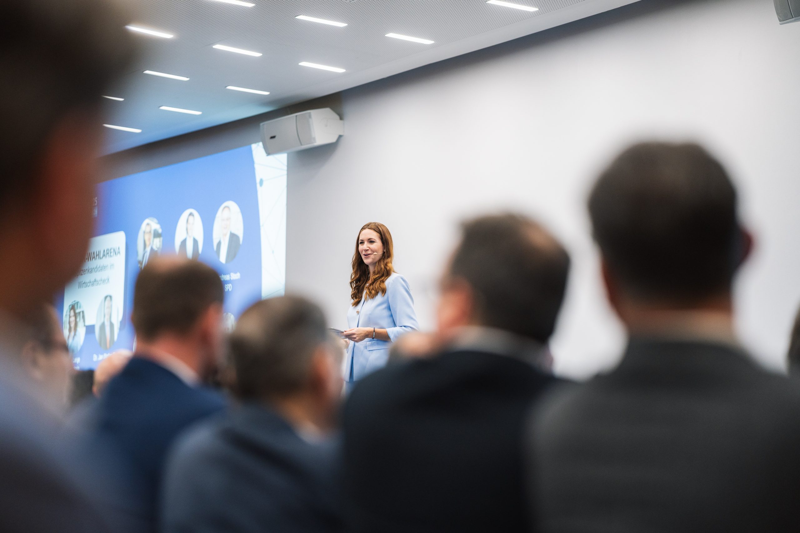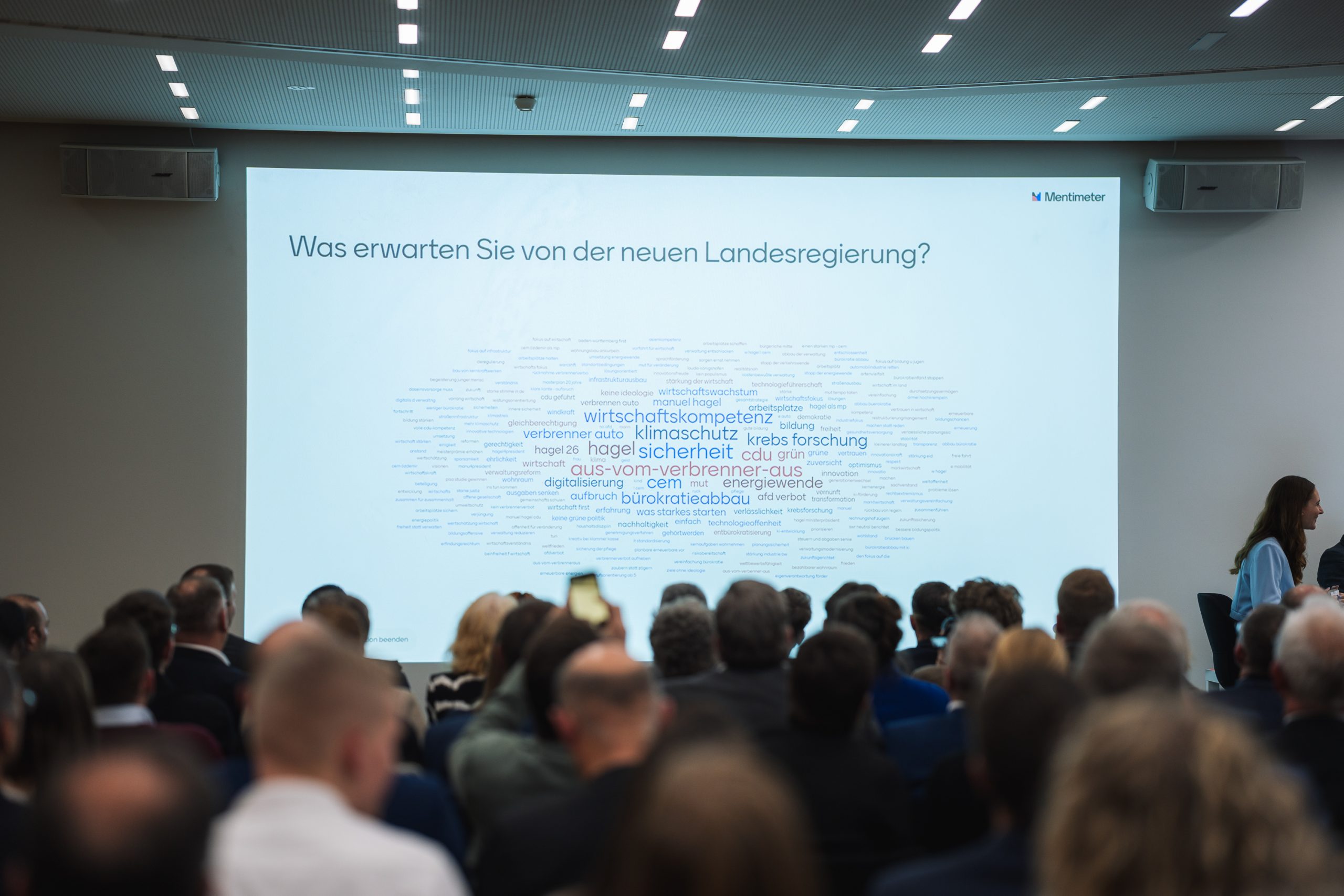 Die Wahlarena nutzte unterschiedliche Elemente für einen umfassenden Wirtschafts-Check. Per getimten je 2-Minuten-Fenstern für Statements und Antworten in allen Themenfeldern sowie mit klaren Ja/Nein-Antwortrunden, in denen die Politiker entsprechende Schilder hochhalten und damit Farbe bekennen mussten, schufen wir gleichberechtigt und transparent Raum für klare Positionen, unternehmerische Perspektiven und konkrete Erwartungen an die nächste Landesregierung. Eine Mentimeter-Abfrage im Publikum, bei der die Kandidatin und die Kandidaten aus den Top-Begriffen der Wortwolke ihre Abschlussstatements formulierten, rundete das Podium ab.