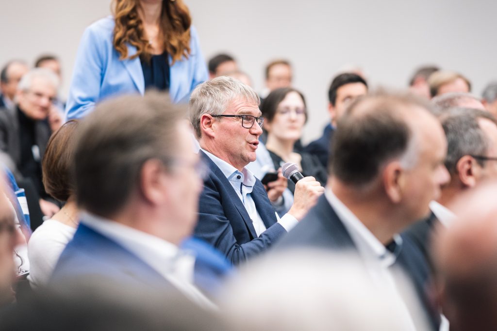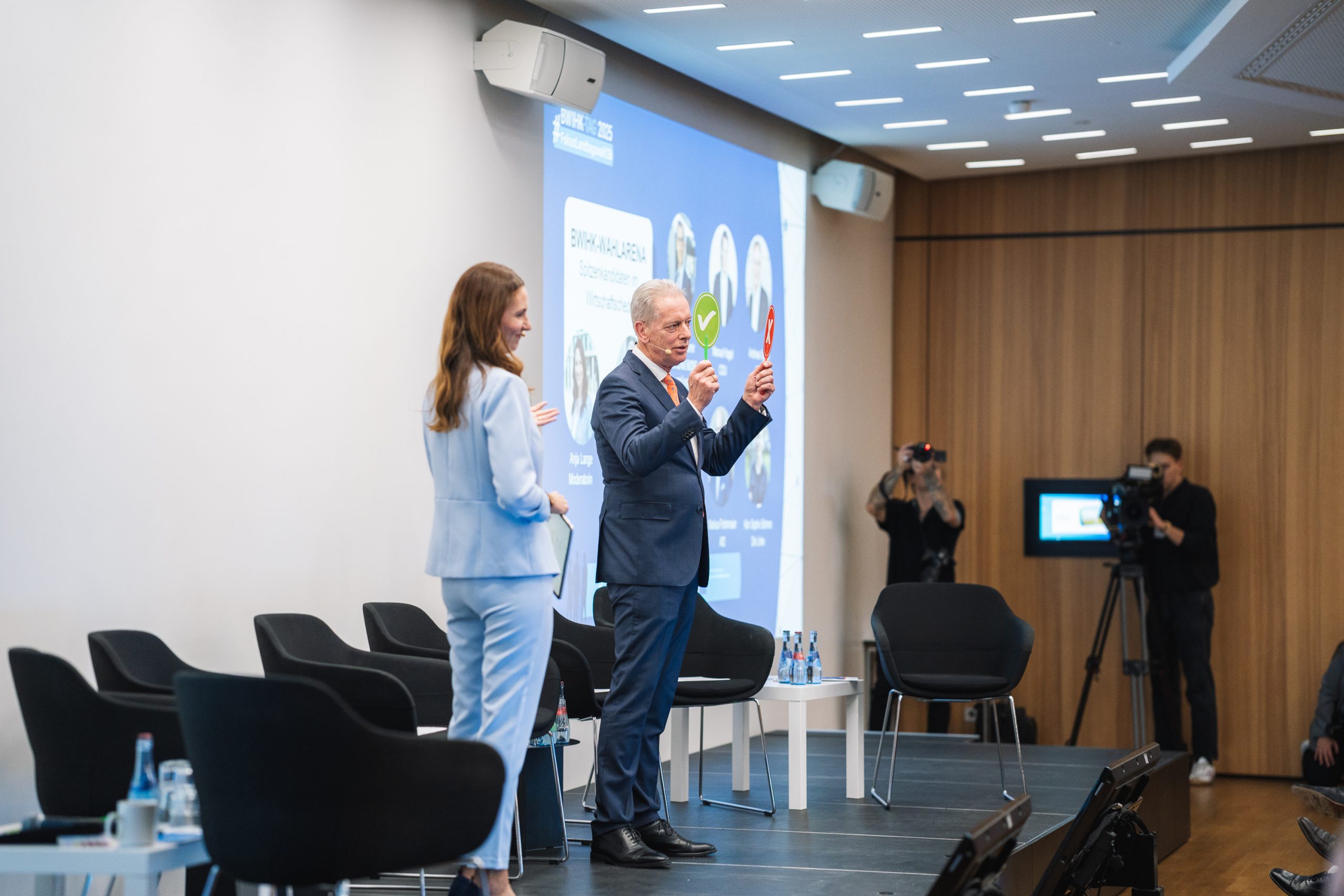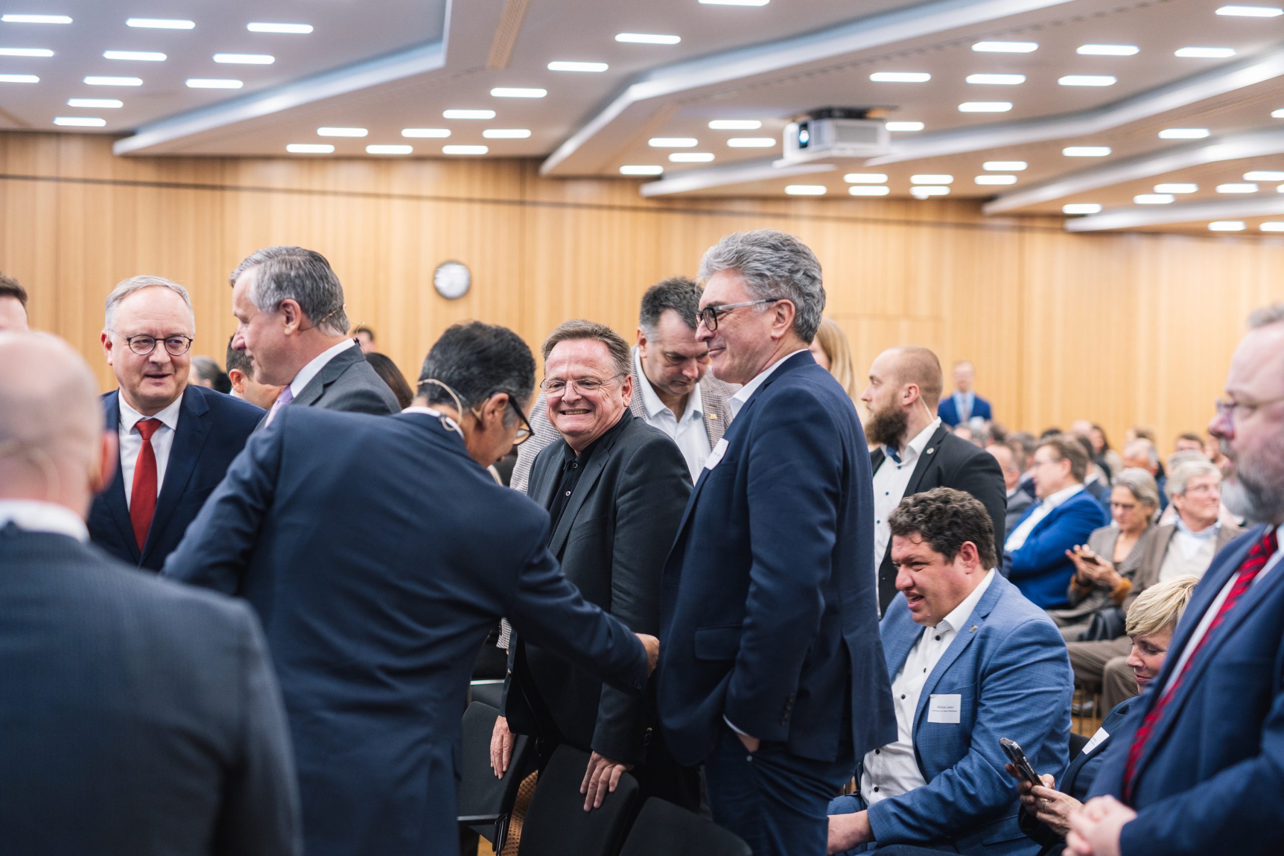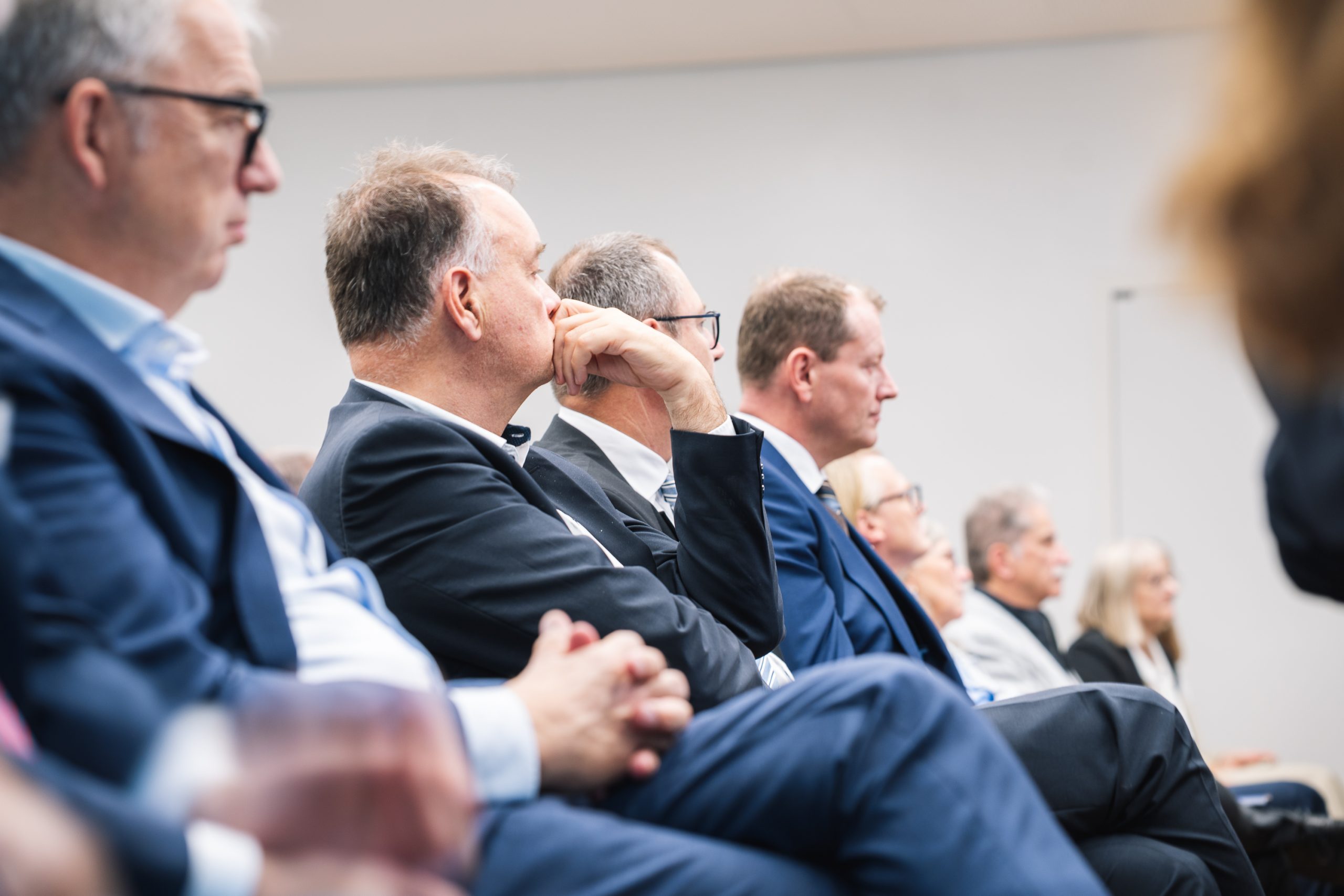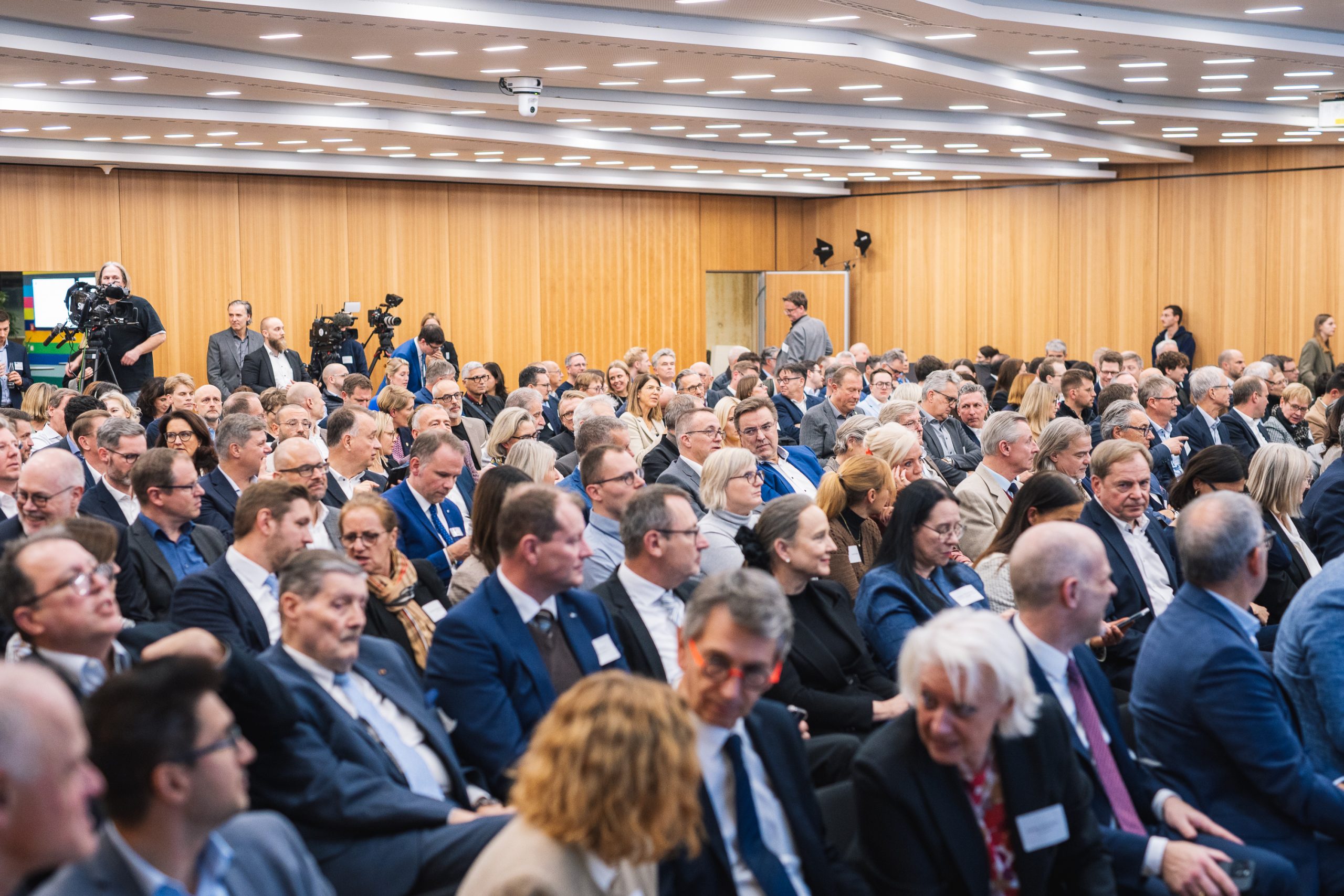 Die Wahlarena nutzte unterschiedliche Elemente für einen umfassenden Wirtschafts-Check. Per getimten je 2-Minuten-Fenstern für Statements und Antworten in allen Themenfeldern sowie mit klaren Ja/Nein-Antwortrunden, in denen die Politiker entsprechende Schilder hochhalten und damit Farbe bekennen mussten, schufen wir gleichberechtigt und transparent Raum für klare Positionen, unternehmerische Perspektiven und konkrete Erwartungen an die nächste Landesregierung. Eine Mentimeter-Abfrage im Publikum, bei der die Kandidatin und die Kandidaten aus den Top-Begriffen der Wortwolke ihre Abschlussstatements formulierten, rundete das Podium ab.