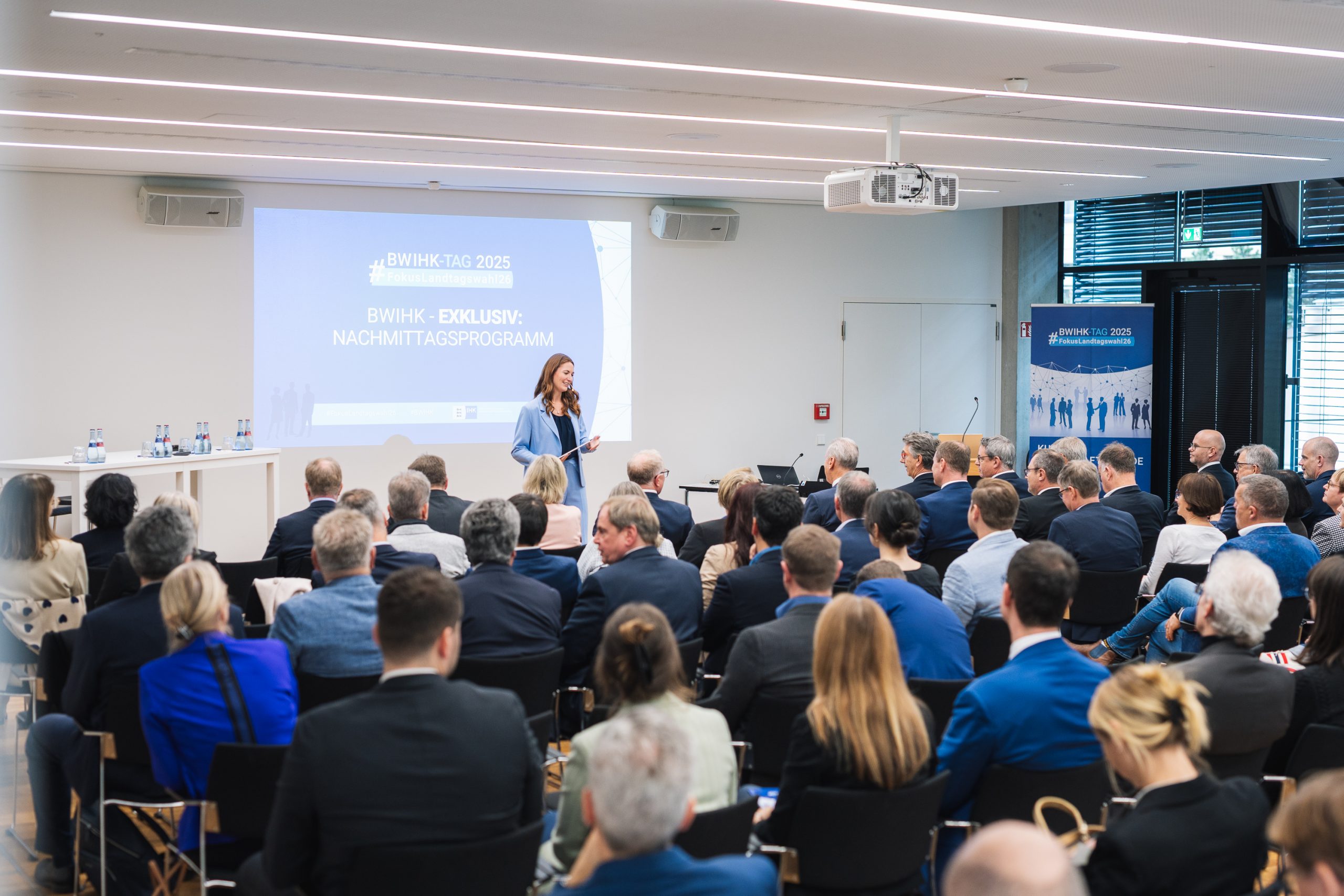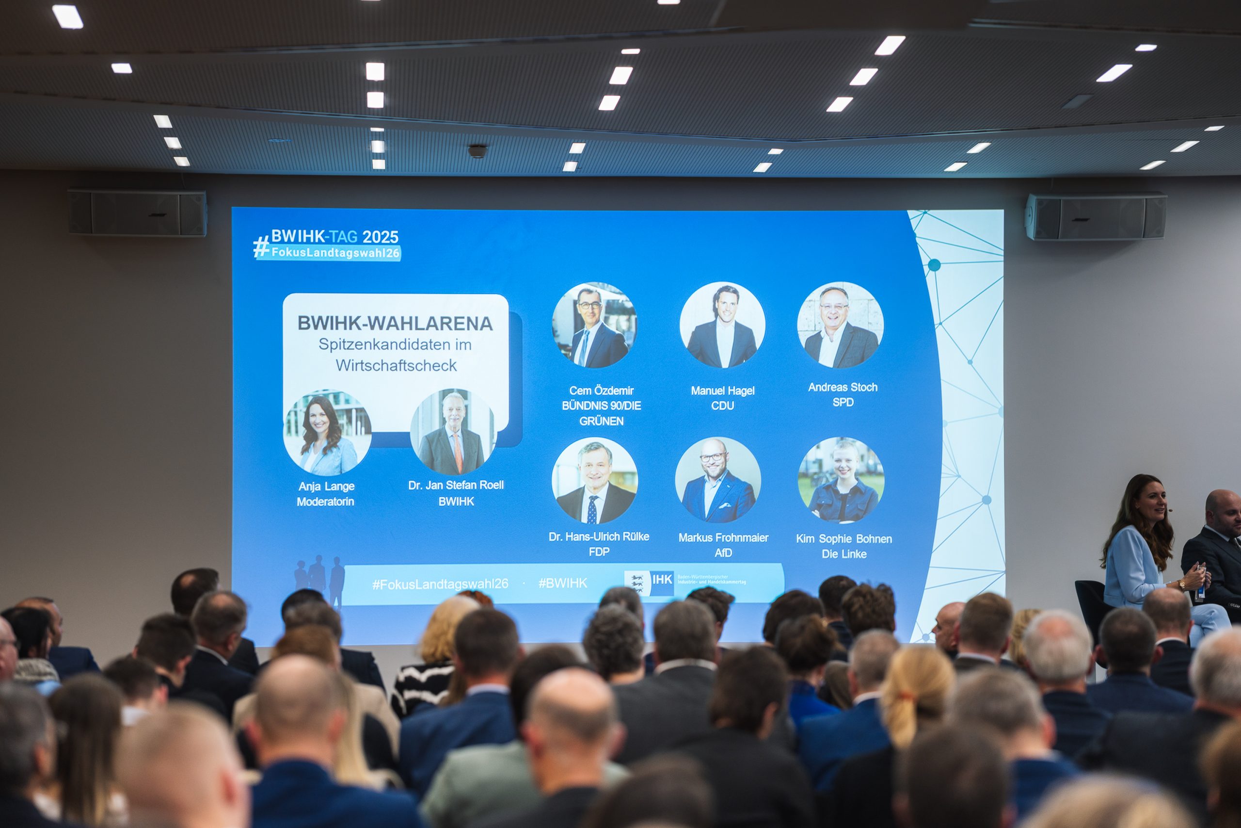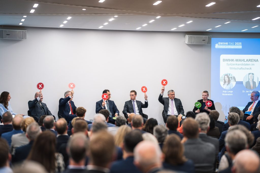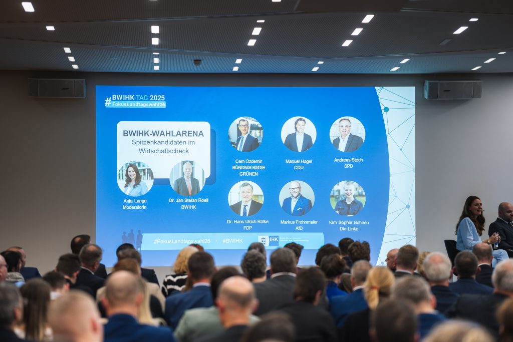 Kurs Wirtschaftswende – Welche Politik braucht der Standort Baden-Württemberg? Wenige Monate vor der Landtagswahl 2026 diskutierten alle Spitzenkandidaten der Parteien für den dann 18. Landtag mit der Wirtschaft über die Zukunft Baden-Württembergs im öffentlichkeitswirksamen Auftakt des BWIHK zur Landtagswahl 2026.