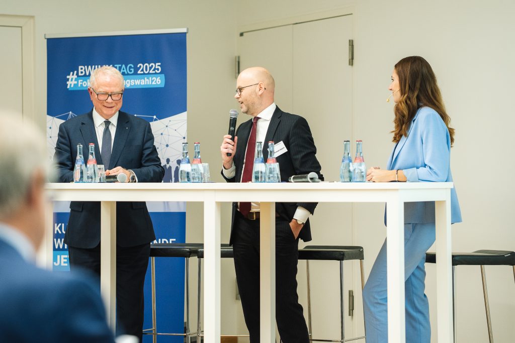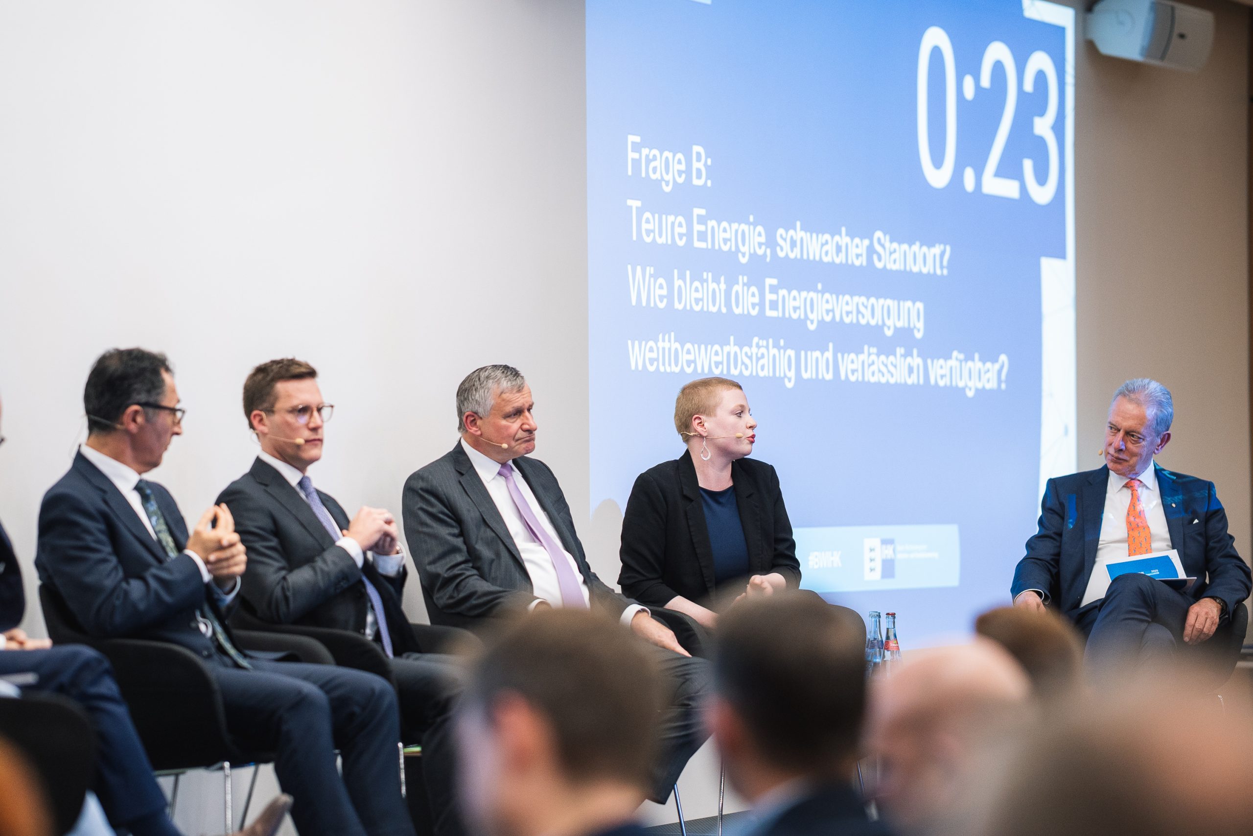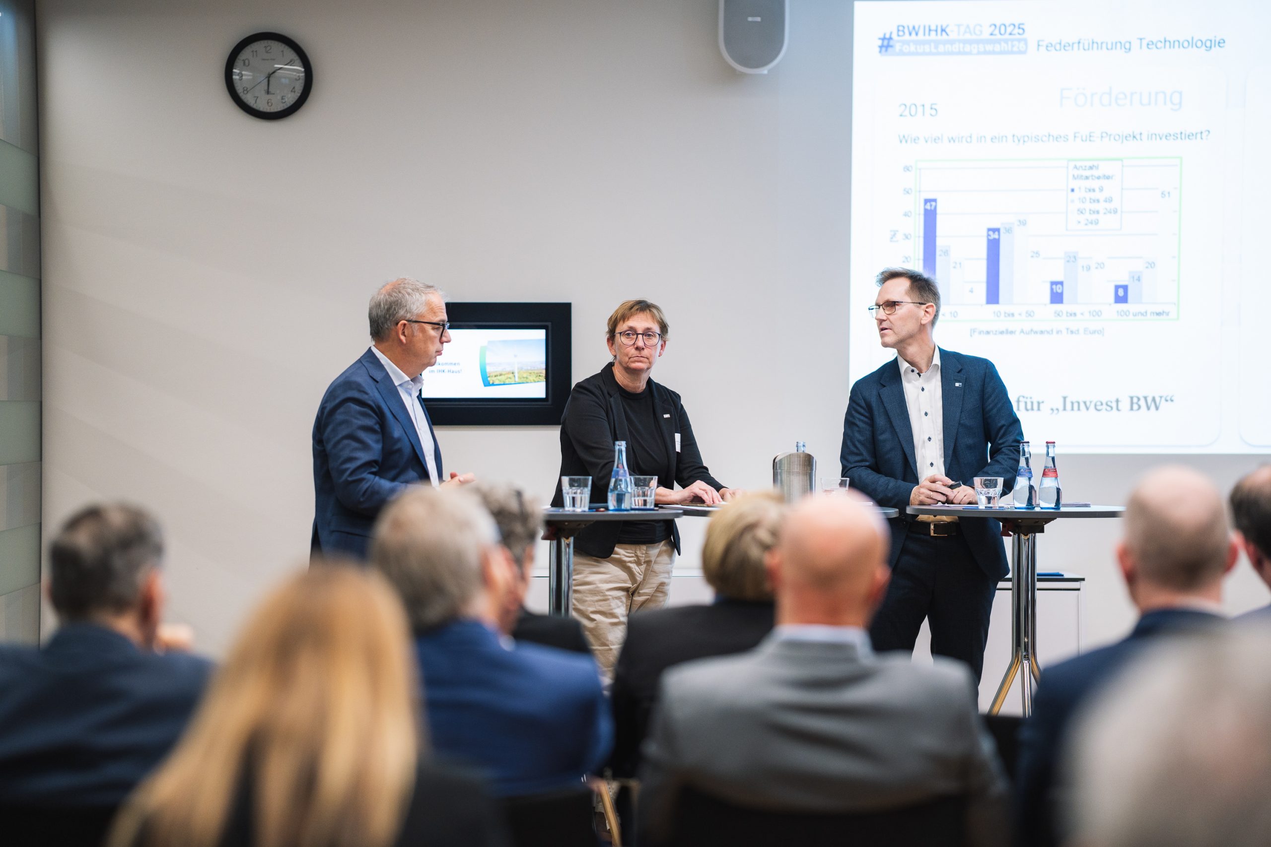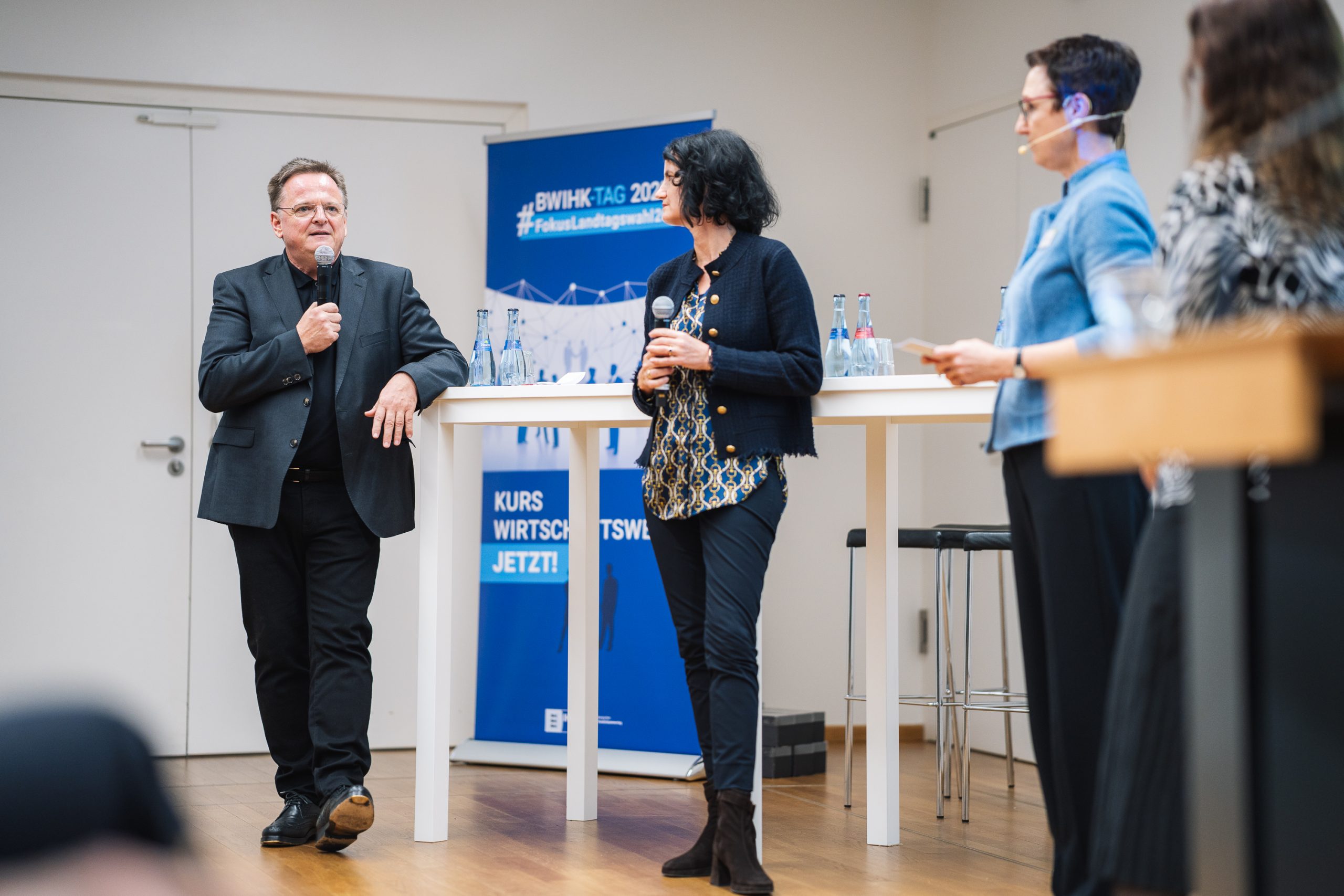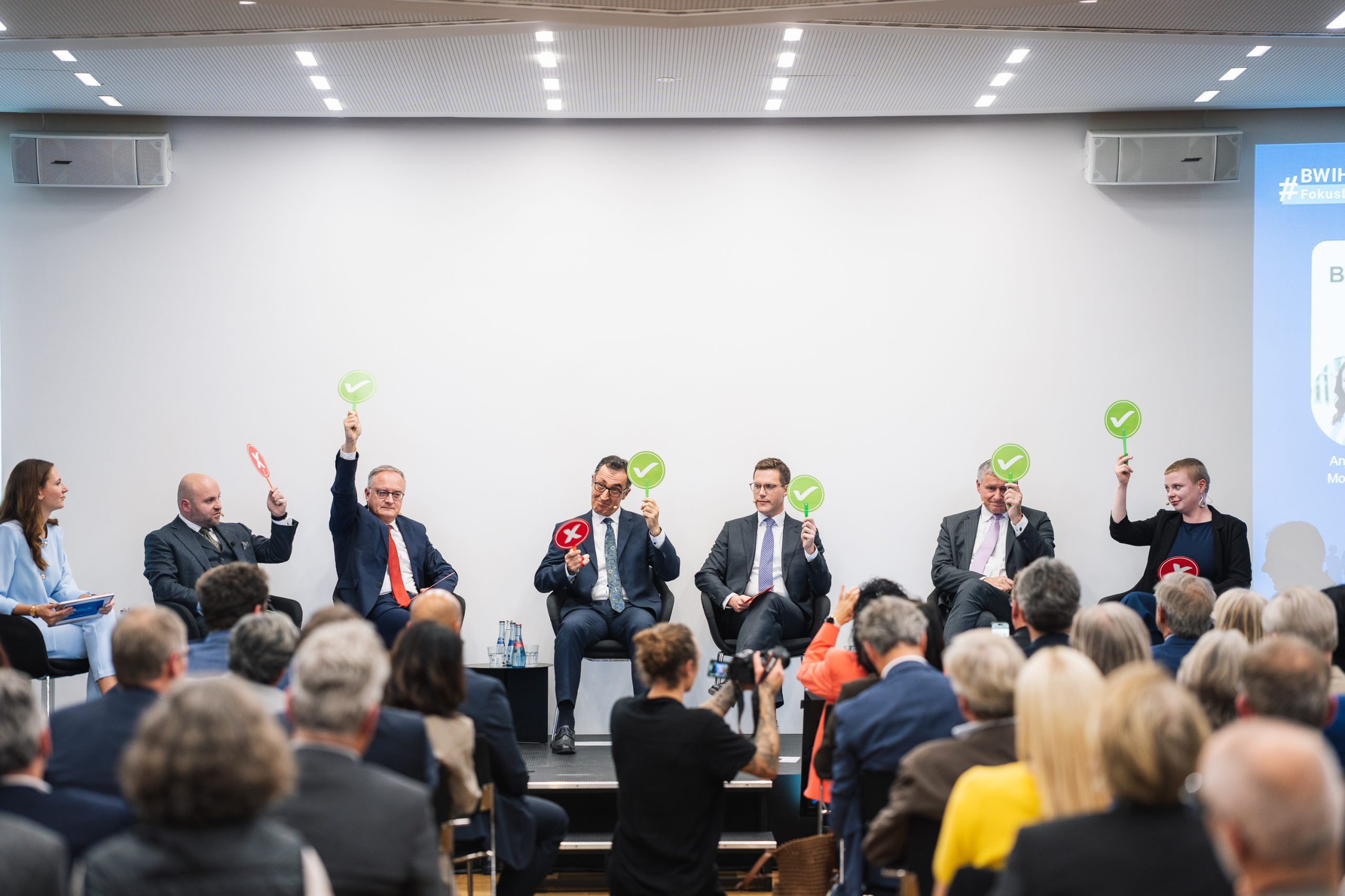 den wirtschaftspolitischen Fragestellungen und Erwartungen der Südwestwirtschaft in den Themenfeldern Bürokratie und Regulatorik, Energie sowie Bildung und Fachkräfte. Moderiert wurde die zweistündige Diskussion von Anja Lange und BWIHK-Präsident Dr. Roell.